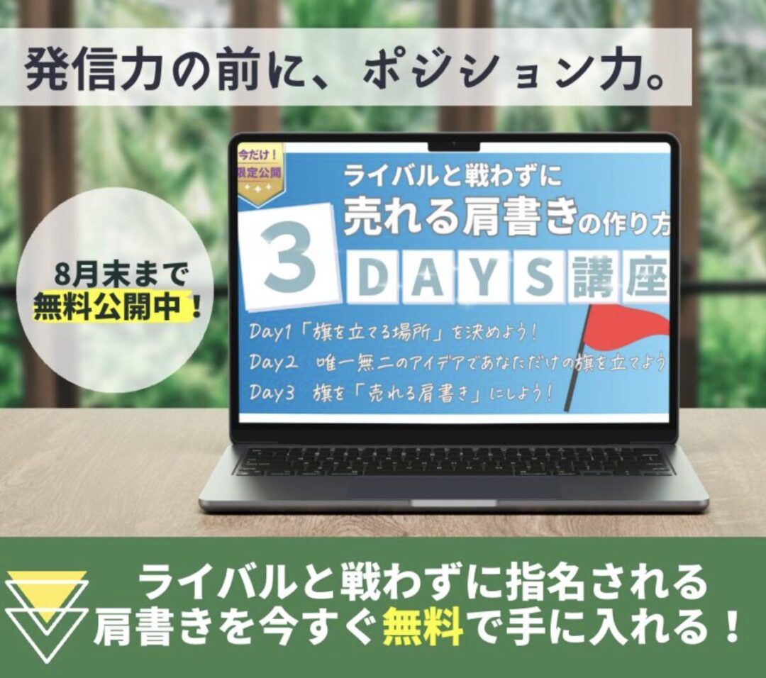ライバル不在の場所で、あなたにしか立てられない旗を掲げて“高単価でも売れる肩書き”を手に入れましょう。