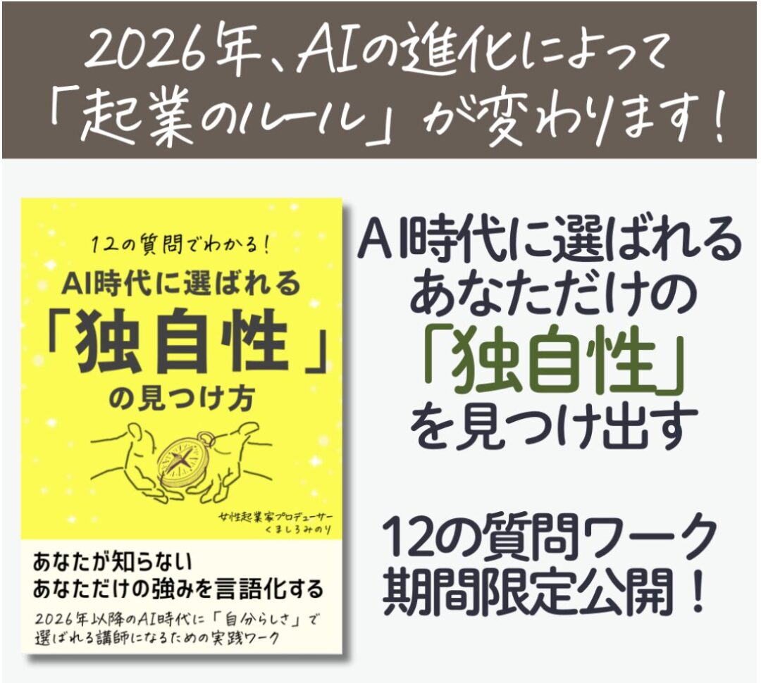 この電子書籍では、AI時代にお客様やAIから選ばれる講師になるために必要な、あなた自身の「独自性の核」を見つけ出すための【12の質問ワーク】を収録しています。